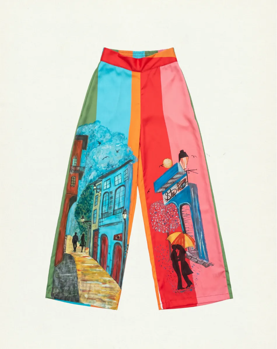 Hand-painted pants that tell a timeless love story. Between cobblestone streets and a kiss under the rain with a yellow umbrella, every brushstroke is a unique piece of art. Flowy fabric, flawless drape, and a vibrant design that will make you feel like the heroine of your own romantic movie.