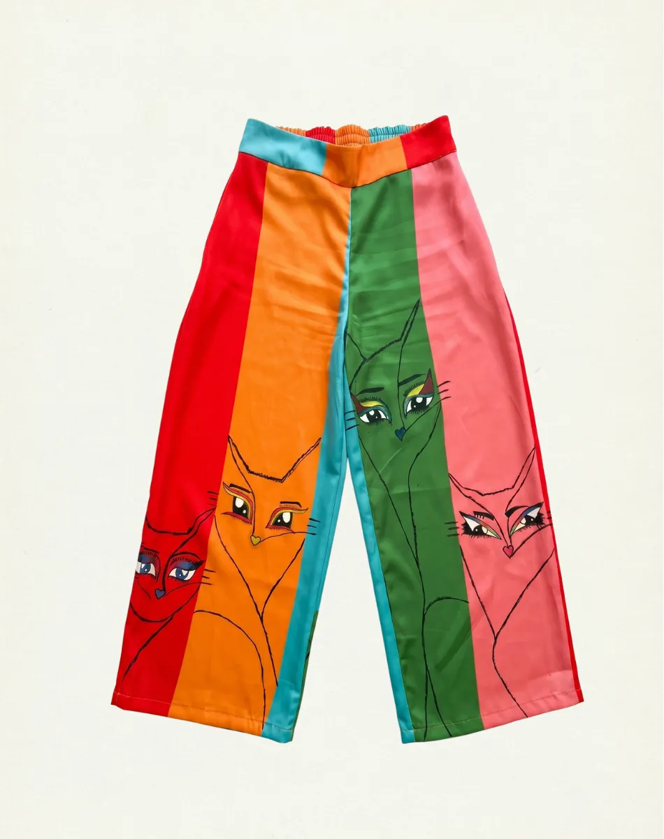 Hand-painted pants inspired by the wild, clever, and mysterious spirit of the fox. Four expressive feminine fox faces — painted across vibrant color blocks of red, orange, green, and coral — for the woman who is fierce, confident, and unapologetically herself. Flowy fabric, wide-leg cut, and a look that turns heads everywhere you go.
